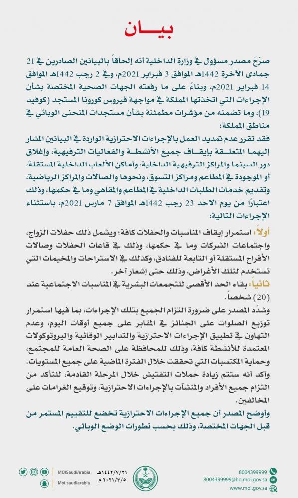 الداخلية : عدم تمديد العمل بالإجراءات الاحترازية اعتبارًا من الأحد القادم