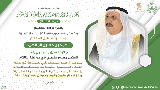 سمو #أمير_منطقة_جازان يهنئ #تعليم_صبيا بتحقيق المعلم أحمد المالكي جائزة الشيخ محمد بن زايد لأفضل معلم خليجي ، مؤكدا أن هذه المنجزات تأتي بفضل الله ثم بدعم القيادة الحكيمة،مثمنًا سموه جهود #وزارة_تعليم بتطوير العملية التعليمية ورفع أداء المعلمين والمعلمات وفق #رؤية_المملكة_2030.