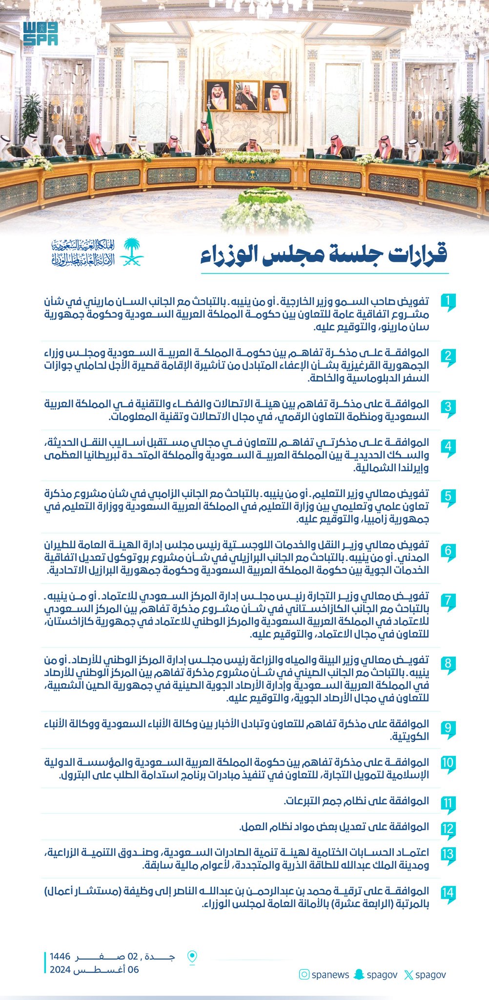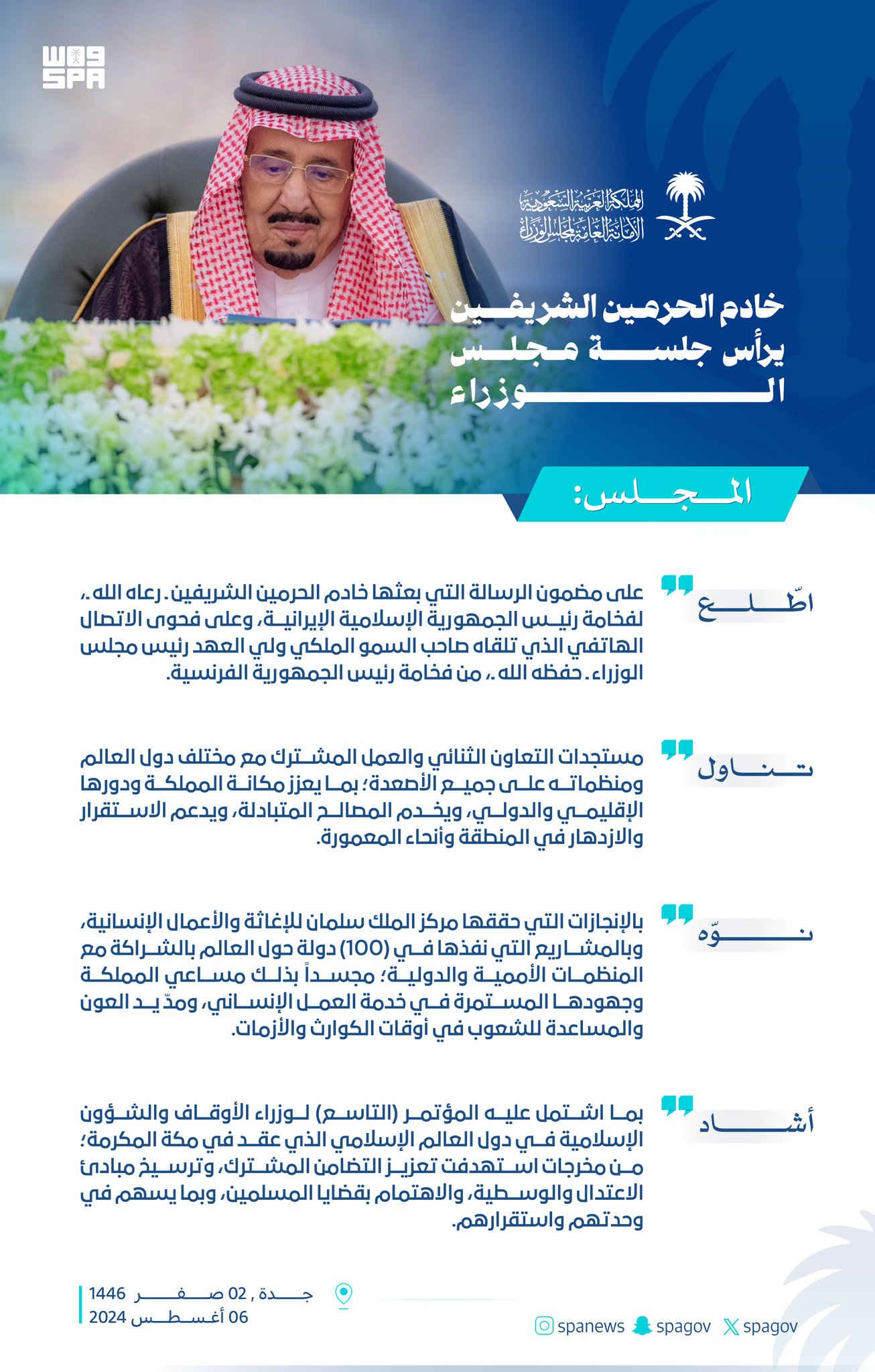 خادم الحرمين الشريفين يرأس جلسة مجلس الوزراء 6-8-2024