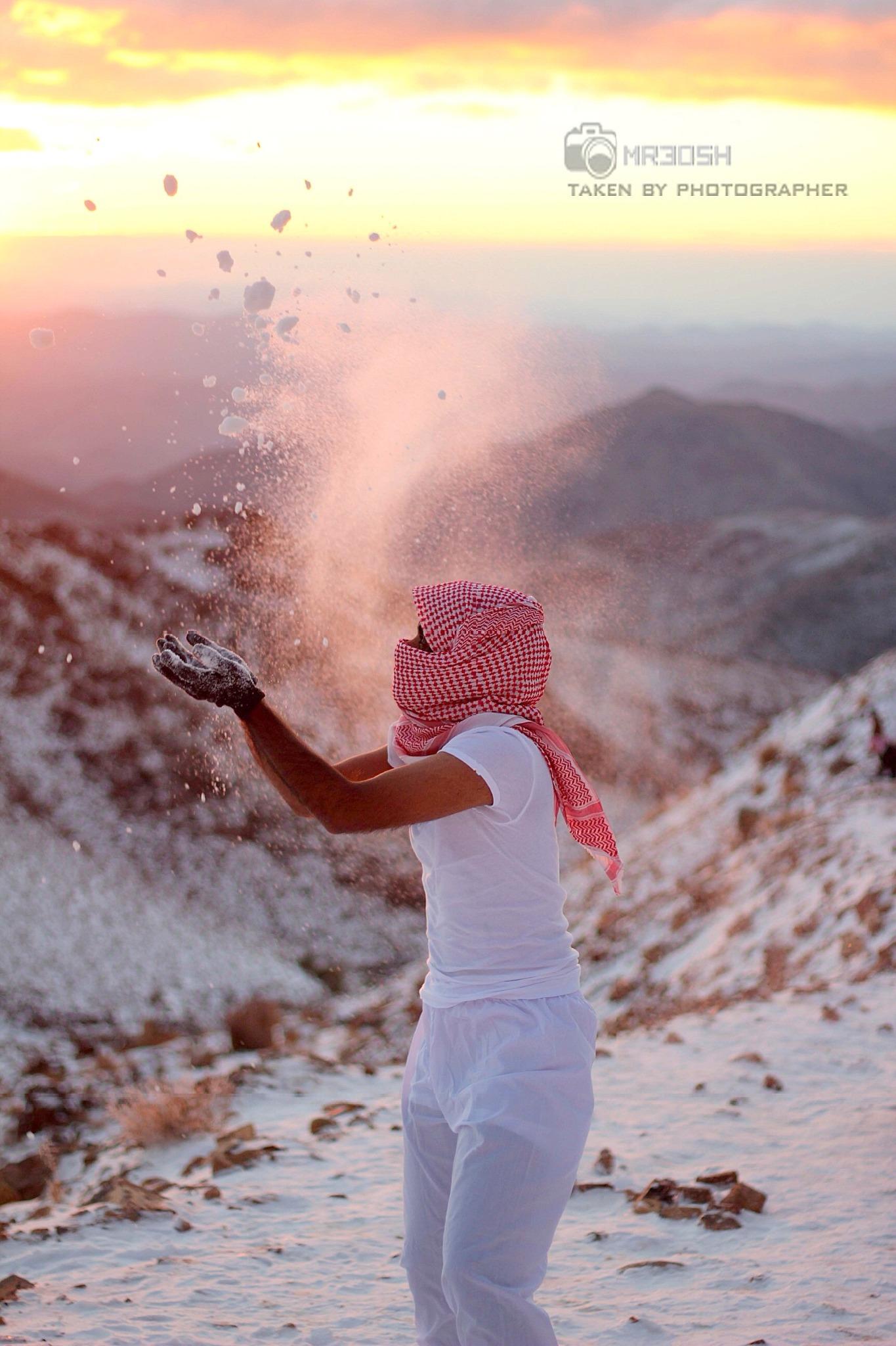 سعودي يعبر عن فرحته بالثلوج بطريقته الخاصة