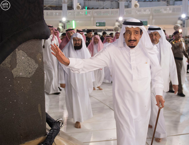 ولدى وصوله - رعاه الله - ساحة المسجد الحرام يرافقه صاحب السمو الملكي الأمير محمد بن نايف بن عبدالعزيز ولي العهد نائب رئيس مجلس الوزراء وزير الداخلية كان في استقبال الملك المفدى صاحب السمو الملكي الأمير خالد الفيصل بن عبدالعزيز مستشار خادم الحرمين الشريفين أمير منطقة مكة المكرمة ، وصاحب السمو الملكي الأمير مشعل بن ماجد بن عبدالعزيز محافظ جدة ، وصاحب السمو الأمير فيصل بن محمد بن سعد بن عبدالرحمن وكيل إمارة منطقة مكة المكرمة المساعد للحقوق ، ومعالي الرئيس العام لشؤون المسجد الحرام والمسجد النبوي الشيخ الدكتور عبدالرحمن بن عبدالعزيز السديس ، ومعالي نائب الرئيس العام لشؤون المسجد الحرام الشيخ الدكتور محمد بن ناصر الخزيم.