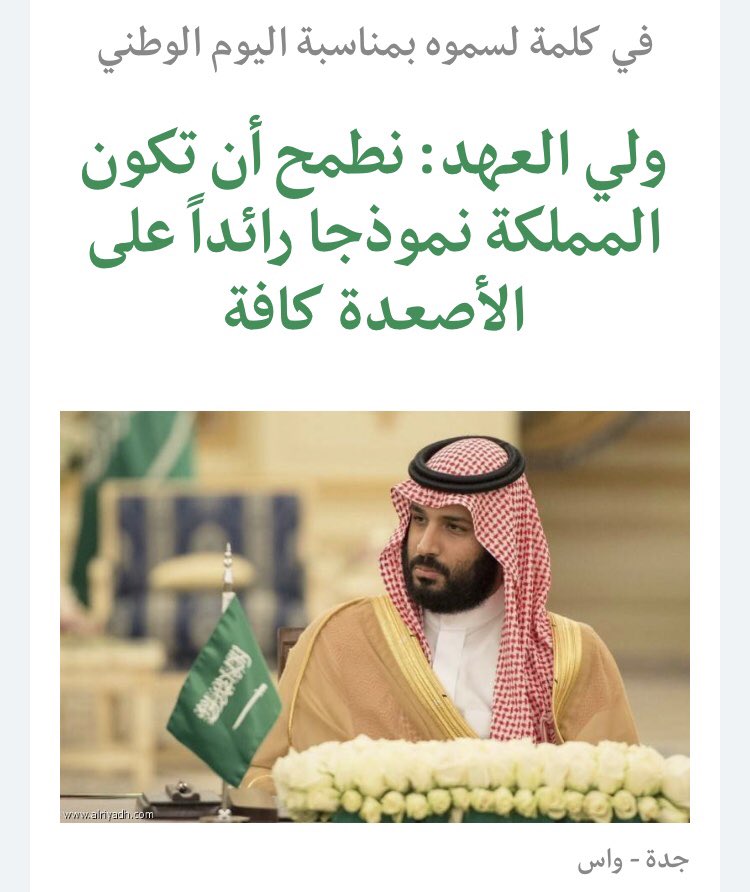 أكد صاحب السمو الملكي الأمير محمد بن سلمان بن عبدالعزيز ولي العهد نائب رئيس مجلس الوزراء وزير الدفاع ، أن مناسبة الذكرى السابعة والثمانين للمملكة العربية السعودية ، مناسبة نستحضر فيها ما قام به مؤسس بلادنا وباني نهضتها الملك عبدالعزيز بن عبدالرحمن آل سعود - رحمه الله - وأبناؤه البررة من بعده ، منوهًا بما تشهده المملكة من نمو وازدهار تحت قيادة خادم الحرمين الشريفين الملك سلمان بن عبدالعزيز آل سعود - حفظه الله - .