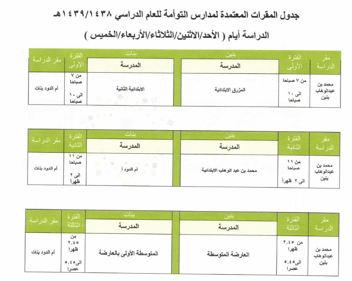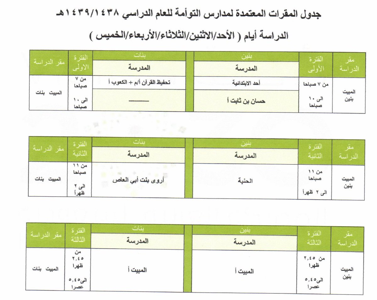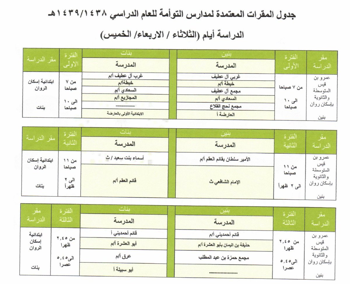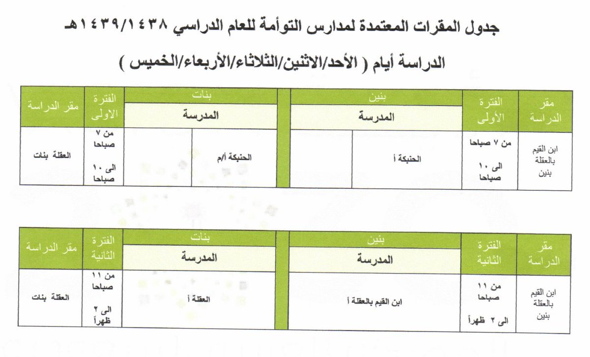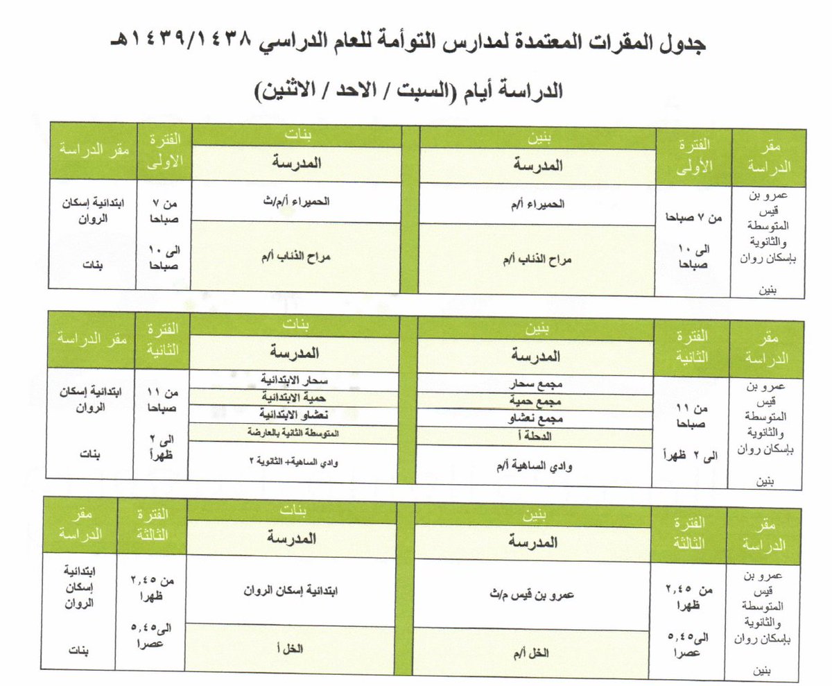 • جداول المقرات المعتمدة لمدارس التوأمة في تعليم العارضة 1439